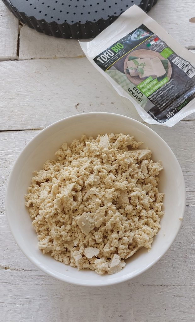 Lave e seque bem o tofu e esfarele-o bem em uma tigela.