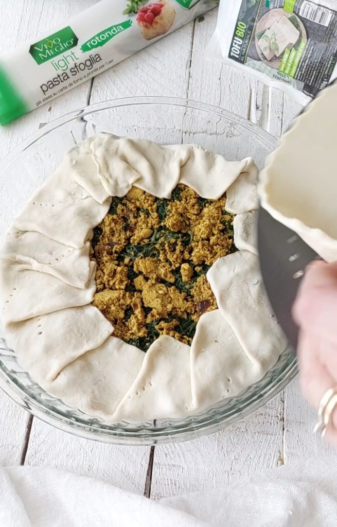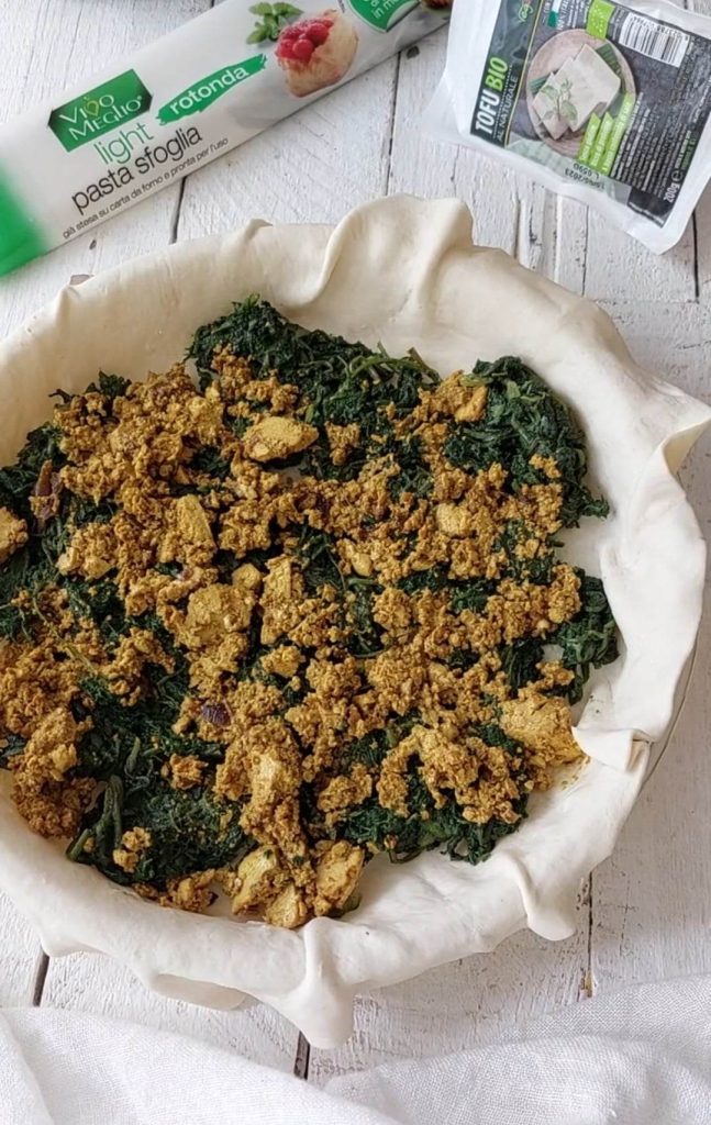 Para esta brisé, de fato, usei ervas frescas do campo, cozidas e refogadas em frigideira com alho e aromas, e recheadas em dois círculos de massa folhada pronta, misturadas com um ótimo tofu que eu esfarelei.