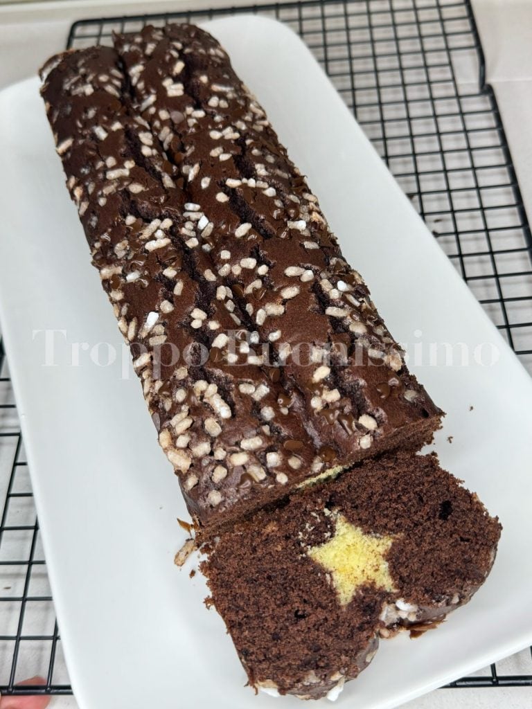 À massa restante, adicione o cacau em pó e duas colheres de sopa de leite, misturando bem até obter uma consistência homogênea e escura. Agora pegue uma forma de bolo inglês untada e enfarinhada e despeje no fundo uma fina camada da massa de cacau. Coloque as estrelinhas de baunilha no centro, tentando mantê-las retas e bem alinhadas, depois cubra com o restante da massa de cacau, garantindo que as estrelinhas fiquem completamente submersas.Decore com açúcar granulado e gotas de chocolate e asse a 170°C por cerca de 35-40 minutos, ou até que um palito saia limpo. Deixe o bolo inglês esfriar completamente antes de desenformar e cortar, assim você obterá um corte limpo que mostrará perfeitamente sua estrelinha no centro.