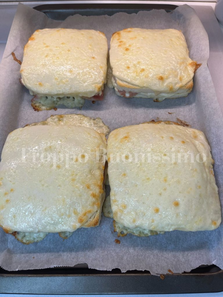• Cubra com outra fatia de pão para sanduíche. Guarneça com molho bechamel e o queijo ralado a pasta filata.