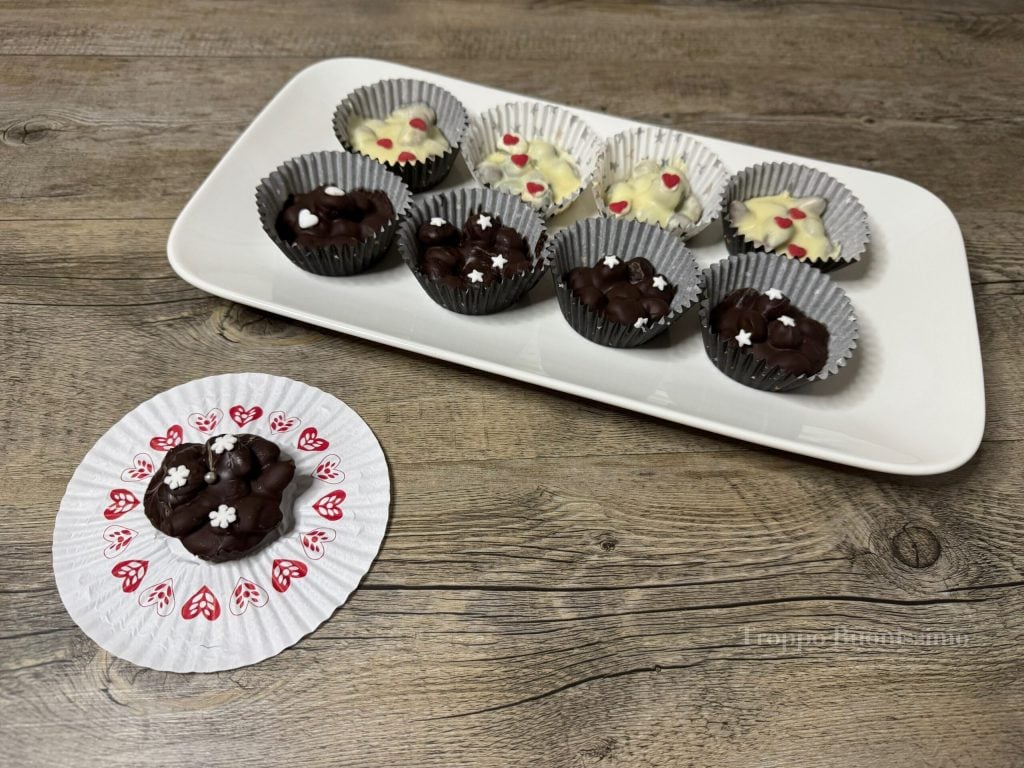 Derreta o chocolate amargo no micro-ondas (serão necessários 2 minutos) ou em banho-maria, tomando cuidado para não queimar. Uma vez que as frutas secas estejam frias, junte-as ao chocolate derretido e misture bem, até obter uma mistura homogênea. Coloque forminhas de papel em uma bandeja e, com uma colher, distribua a mistura de frutas secas e chocolate nas forminhas. Antes que os docinhos endureçam completamente, decore a superfície com confetes coloridos. Deixe os docinhos endurecerem em temperatura ambiente por pelo menos 30 minutos.
