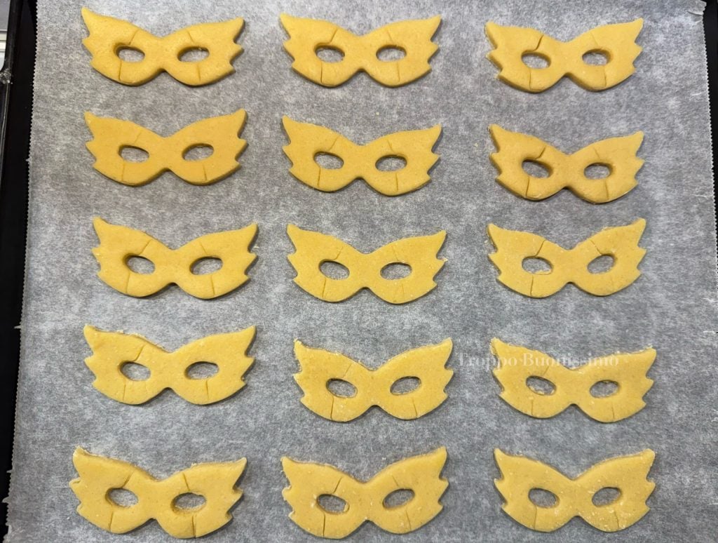 Abra a massa em uma superfície enfarinhada, até uma espessura de cerca de 5 mm. Com um cortador em forma de máscara (ou uma faca afiada), corte as formas e transfira-as para uma assadeira forrada com papel manteiga.Pincele as máscaras com um pouco de leite ou manteiga derretida, polvilhe com granulado de açúcar.