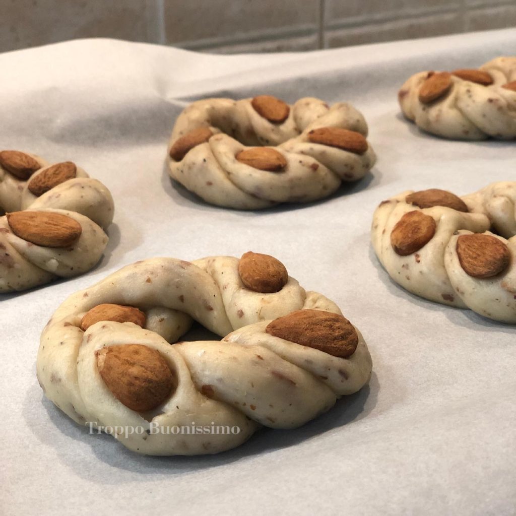 2. Insira as amêndoas no entrelaçamento de cada tarallo.1. Cubra os taralli com um pano e deixe crescer em um local quente por 2-3 horas.