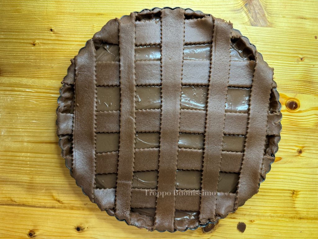 Se o creme de avelã estiver muito denso, aqueça por alguns segundos no micro-ondas para torná-lo mais fluido, depois despeje diretamente sobre a massa e nivele com uma espátula. Disponha as tiras de massa por cima.Cubra a torta com uma folha de papel alumínio e asse na penúltima prateleira do forno estático a 180°C por 22 minutos.