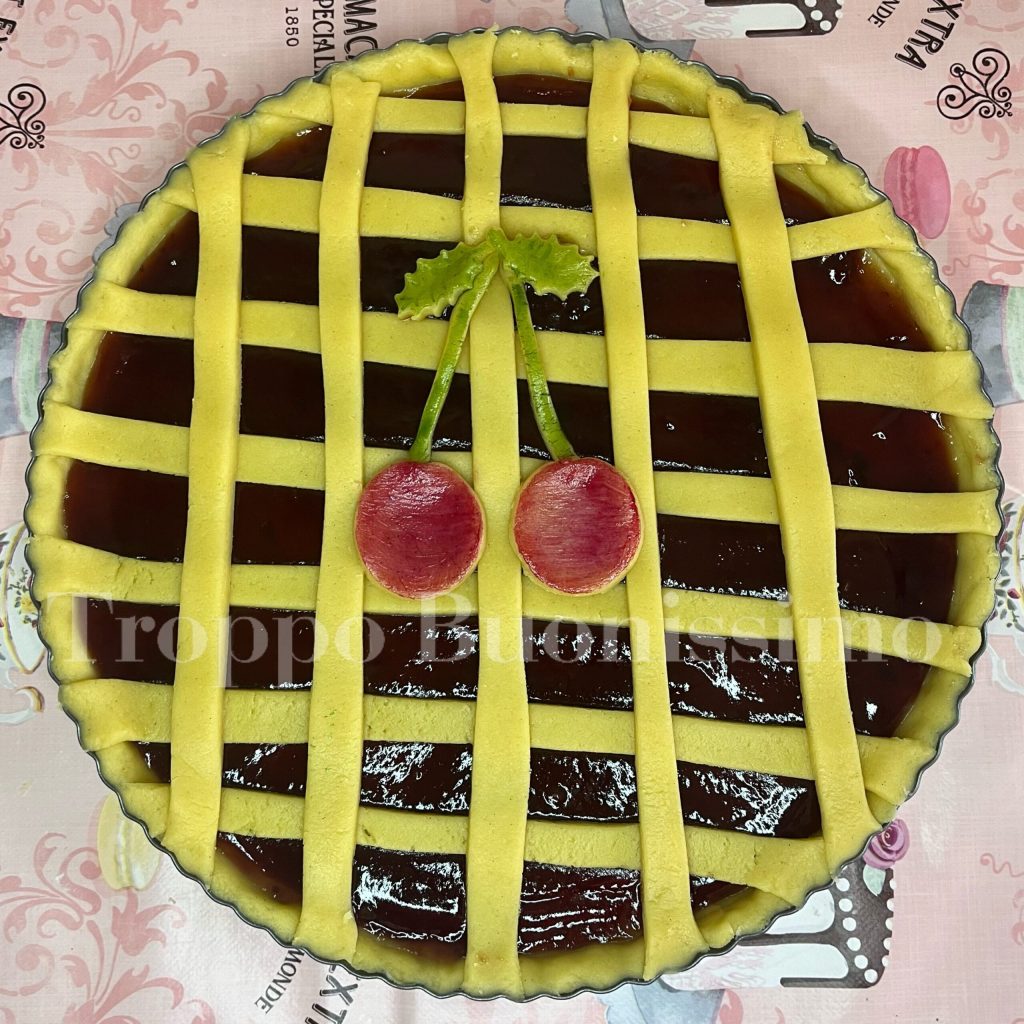 Com a ajuda de um rolo, estenda a massa sobre uma superfície enfarinhada até obter uma espessura de 3/4 mm, coloque uma parte em uma forma previamente untada e enfarinhada, adicione a geleia de cereja, disponha por cima as tiras de massa podre. Se quiser decorá-la como a minha torta, crie no centro uma cereja com dois discos, duas tiras e duas folhinhas de massa podre (se quiser colorir, use corantes alimentares naturais! Eu usei os em pó!).