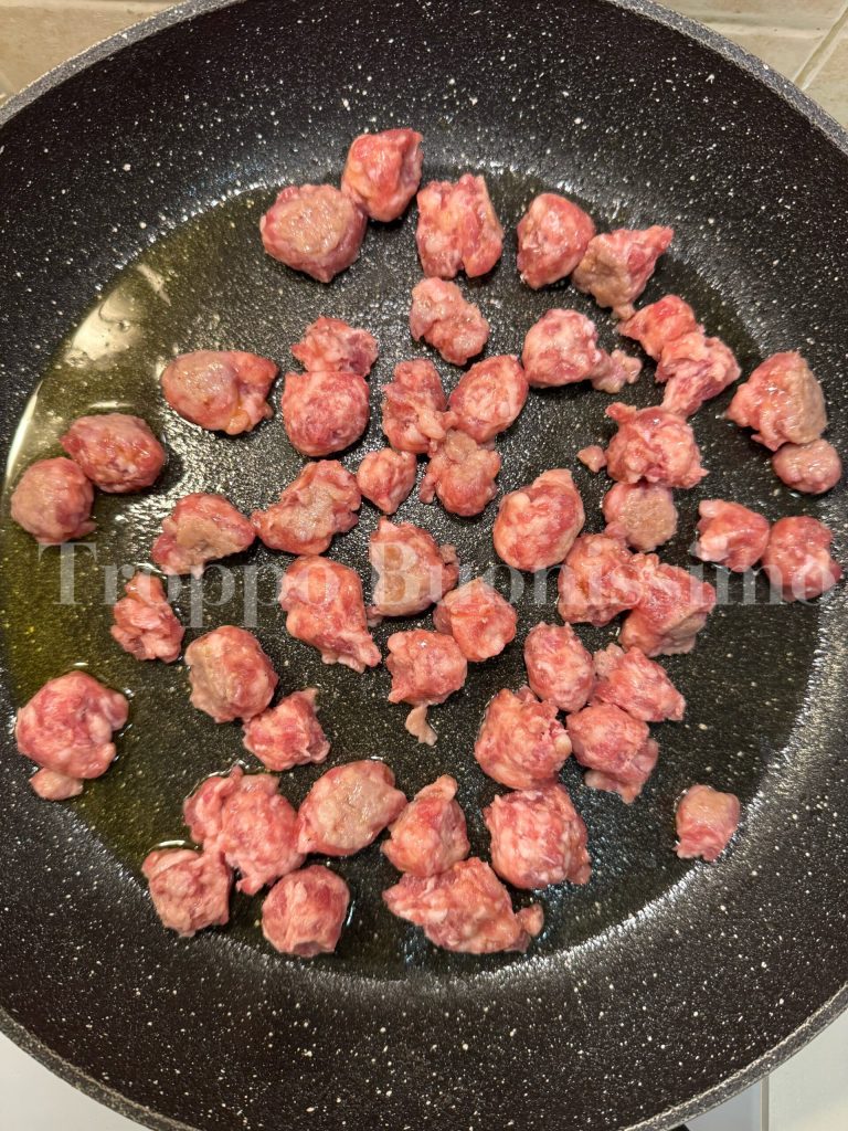 Enquanto isso, em outra frigideira, adicione um fio de óleo e acrescente a linguiça sem a pele.