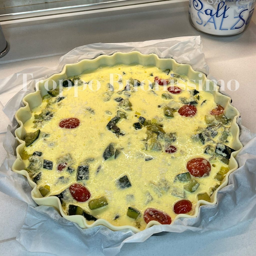 Pré-aqueça o forno em modo estático a 180°C e leve a torta ao forno por cerca de 30/35 minutos até que a superfície esteja dourada e o recheio bem firme.