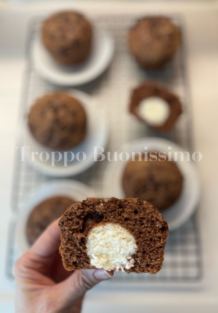 Pré-aqueça o forno a 180°C. Unte e enfarinhe uma forma para grandes muffins e preencha cada forma até a metade com a massa de cacau. Insira uma bolinha de recheio no centro de cada forma, pressionando ligeiramente. Cubra o recheio com um pouco mais de massa de cacau, preenchendo a forma até três quartos.
