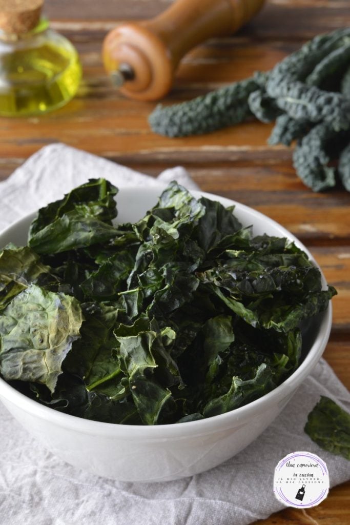 As chips de couve manteiga são super fáceis de preparar e perfeitas para beliscar como um lanche salgado, saudável e saboroso tanto como petisco quanto aperitivo. As folhas de couve manteiga são simplesmente cortadas e temperadas com azeite de oliva extravirgem, sal e pimenta, mas se preferir mais saborosas, você pode adicionar especiarias ou sementes de gergelim. Eu as acho ótimas também como acompanhamento alternativo.