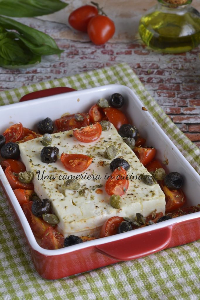 A feta ao estilo mediterrâneo é um prato super rápido, muito fácil e saboroso. De fato, é preparado em pouquíssimos minutos, basta o tempo de preparar os tomatinhos cereja e adicionar os outros ingredientes, como as azeitonas pretas ou gregas (Kalamon, azeitonas de Kalamata), alcaparras, orégano, manjericão e azeite de oliva extravirgem. Pode ser servido tanto como entrada quanto como prato principal.
