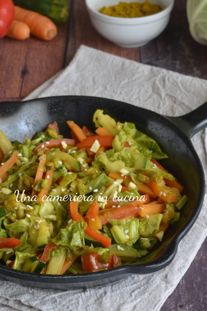 Os legumes temperados na frigideira são leves, saborosos e fáceis de preparar. Deliciosos legumes como pimentão, cenouras, repolho e abobrinhas são cozidos na frigideira e temperados com curry, gengibre fresco, gergelim e molho de soja. Um acompanhamento perfeito para qualquer prato principal, de carne a peixe ou para servir com arroz basmati simplesmente cozido.