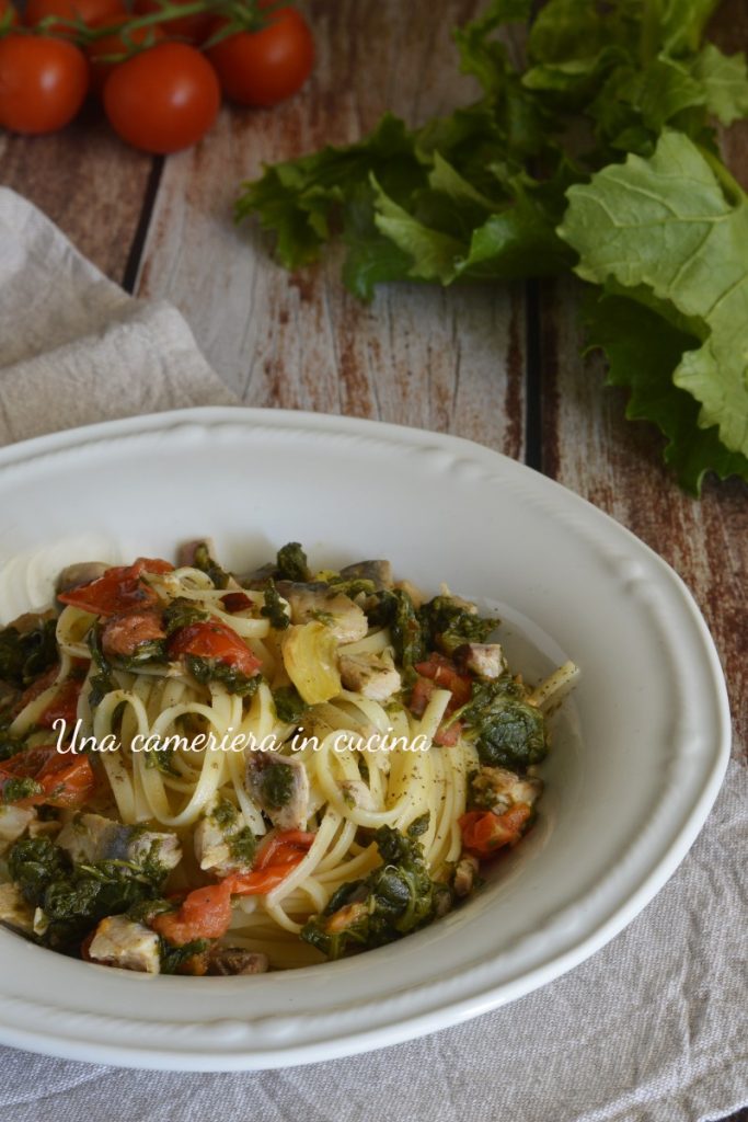 A massa à renaiola é um prato principal saboroso, típico da cidade de Pisa, na Toscana, onde o sabor do mar encontra o da terra. A massa normalmente usada são as linguine ou, ainda melhor, as trenette, mas antigamente isso era substituído por pão. Os outros ingredientes do prato são os grelos de nabo, os tomates-cereja, os arenques marinados (antigamente eram demolhados no leite; eu usei os defumados), alho e pimenta. O nome renaiola vem dos “renaioli”, aqueles que trabalhavam ao longo do rio Arno para transportar a rena (a areia).