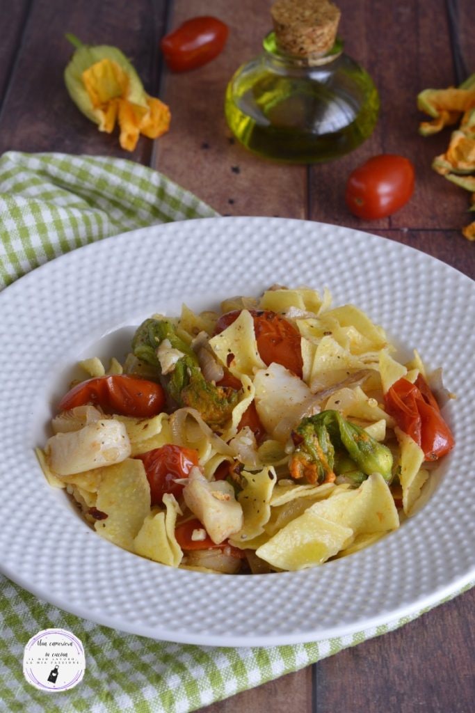 A massa com tomatinhos, peixe-sapo e flores de abóbora é um delicioso primeiro prato simples e fácil de preparar. A receita que proponho foi descoberta durante minha última reunião na sede do Giallozafferano, o autor deste prato é Giorgione, convidado do dia dedicado aos Blog Awards 2024. Em relação à sua versão, fiz uma leve modificação, ou seja, o tipo de massa. Ele, na ocasião, usou massa fresca sem ovos e com farinha integral, eu optei por uma solução mais rápida com massa seca com ovos, como os maltagliati. Digamos que você pode usar qualquer formato de massa, dada a versatilidade do prato.