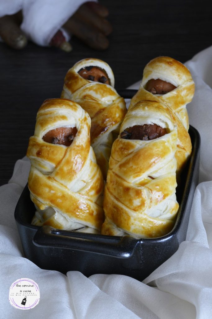 Para começar as comemorações de Halloween, não podem faltar as múmias de salsicha e massa folhada!!! Para as salsichas, escolhi as de porco, mas também podem ser de frango, de peru ou com queijo, de acordo com o gosto, o importante é que sejam grandes. Fáceis e rápidas de preparar são ótimas para servir como aperitivo ou entrada, talvez acompanhadas de maionese ou ketchup. Só resta prepará-las e assá-las!