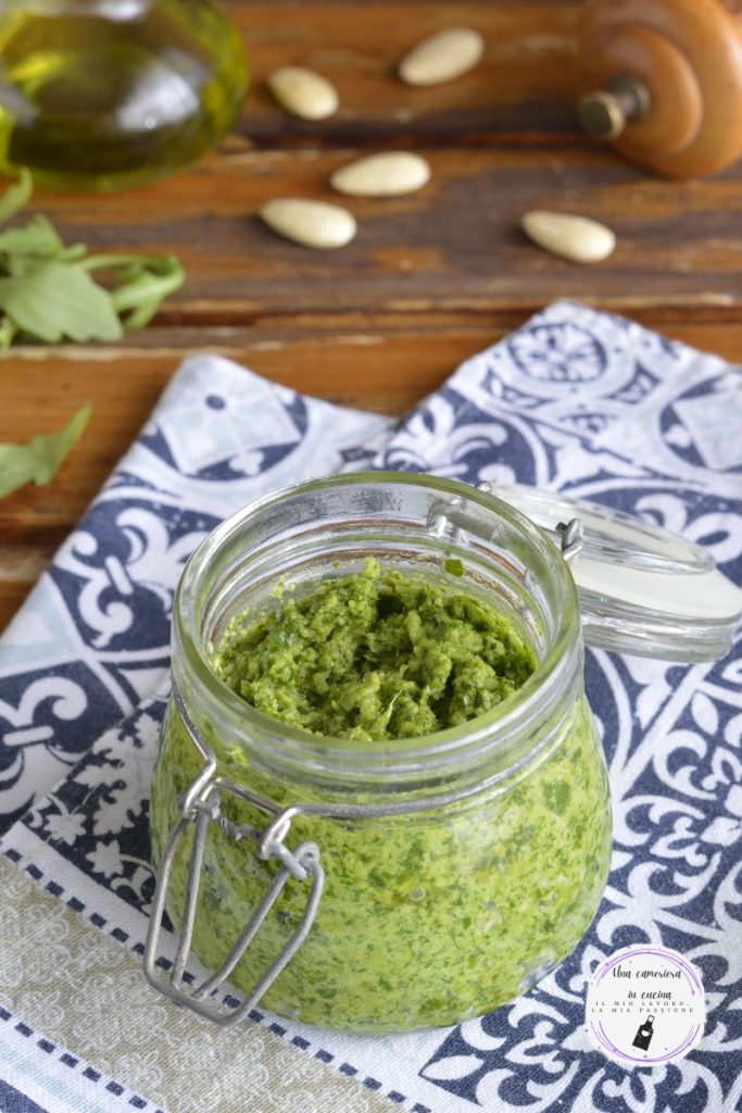 O pesto de rúcula e amêndoas é um delicioso condimento, fresco, leve e é uma ótima variante ao clássico pesto genovês à base de manjericão e pinhões. Para esta receita usei rúcula em pacote, já limpa e lavada, amêndoas sem pele, Grana Padano DOP, pecorino romano e bastante azeite extravirgem de oliva. Você pode usá-lo para temperar massas, enriquecer pratos principais ou espalhá-lo em bruschettas.