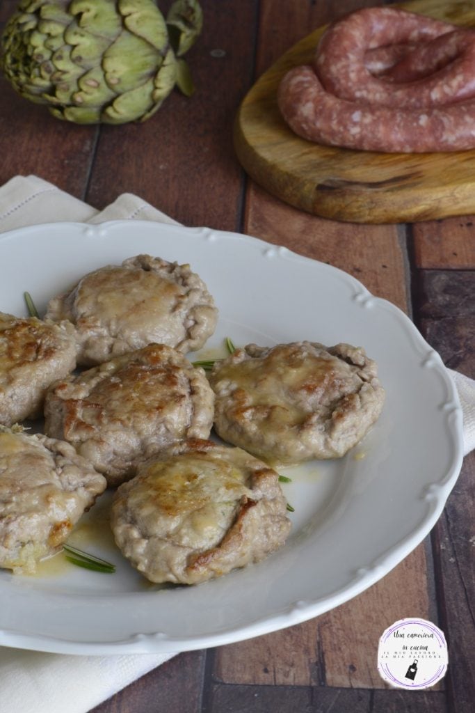 Os rolinhos de carpaccio com alcachofras e linguiça são um segundo prato fácil e saboroso de preparar. A receita é da minha mãe, lembro que quando ela os preparava eram deliciosos, mas ela os chamava de outro jeito, ou seja, “rosetas”. Na verdade, a forma não é a clássica alongada dos rolinhos, fechados com palitos, mas são selados como uma roseta. Para preparar em qualquer momento do ano, porque usei alcachofras congeladas para o recheio, mas se estiverem na estação, você pode optar por frescas. Sirva com o acompanhamento que preferir, eu recomendo purê de batatas.