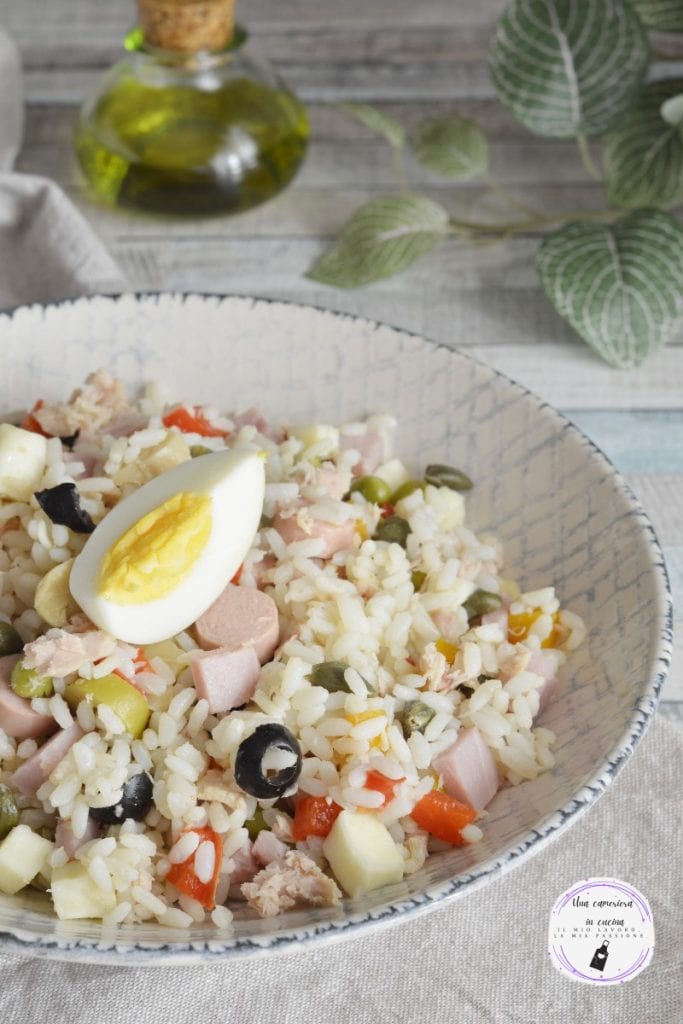 A salada de arroz é um prato da tradição italiana que não pode faltar nas mesas durante a temporada de verão. Fresco e saboroso, é um prato que agrada a todos e pode ser preparado de várias maneiras diferentes, com os ingredientes que você preferir e/ou os que você tiver à disposição, pois também é uma excelente ideia para “limpar a geladeira”. Na minha receita, coloquei azeitonas, presunto cozido, atum, ovo cozido, alcaparras, cebolinhas, cogumelos em conserva, salsichas tipo Frankfurt, ervilhas, mas também legumes como pimentão e cenoura. A versão da minha mãe era mais rápida, pois usava picles, eu optei por alguns vegetais frescos para cozinhar. Ótima para saborear pronta ou fria da geladeira nos dias quentes.