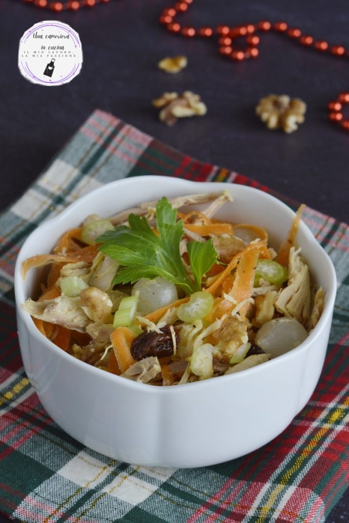 A salada de capão é um prato rápido e simples de preparar, pensado para aproveitar a carne do capão cozida para a preparação do caldo para o cozimento dos cappelletti feitos em casa para a festa de Natal. Pode ser servida como entrada ou mesmo como prato principal. Na minha receita, utilizei os ingredientes disponíveis na geladeira para evitar o desperdício, como as cebolinhas em conserva, o aipo e as cenouras, mas você pode substituí-los a gosto.
