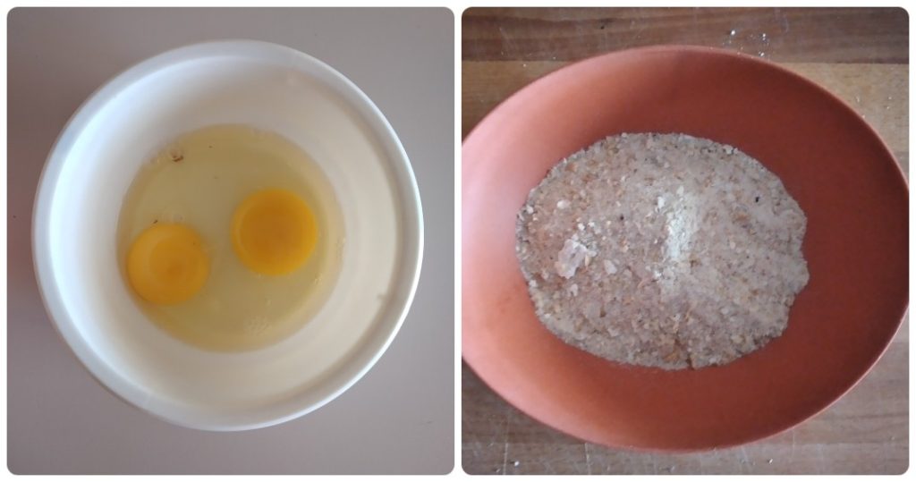 Em duas tigelas distintas, quebre os ovos na primeira e despeje o pão ralado na segunda.