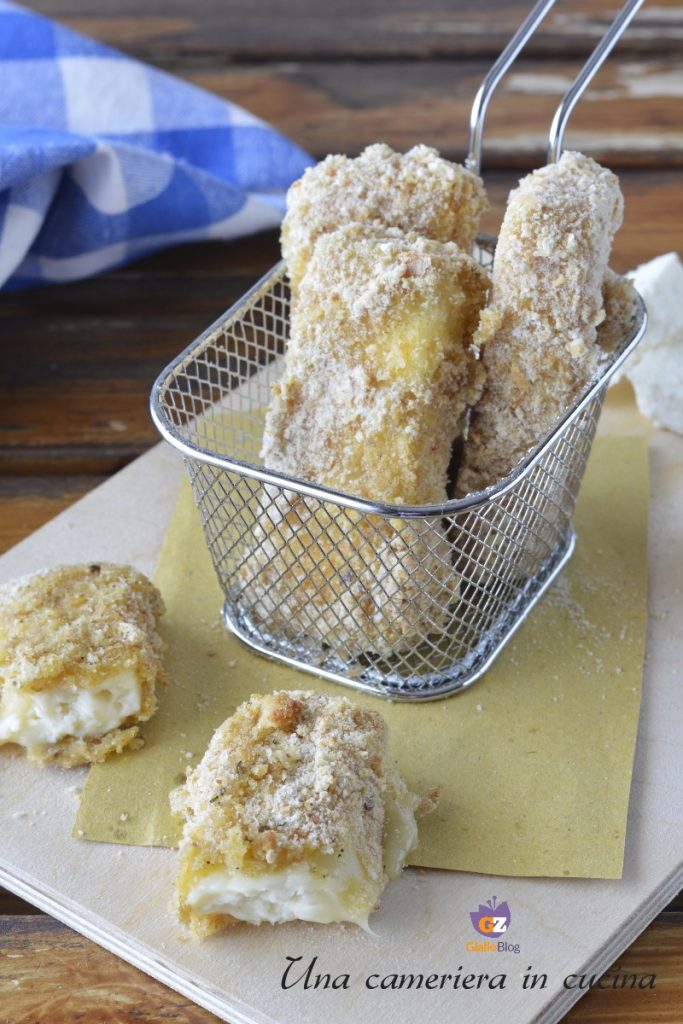 A receita de hoje é perfeita para um aperitivo rápido e saboroso…salva cremasco dourado no forno!!! Palitos de queijo salva cremasco dourados, cobertos com uma crocante, mas leve camada de ovo e pão ralado assados no forno. Este queijo é típico da região de Crema, na província de Cremona, e pode ser saboreado de várias maneiras, simplesmente assim como é ou em receitas mais elaboradas. Sua consistência é muito semelhante à do quartirolo lombardo D.O.P.