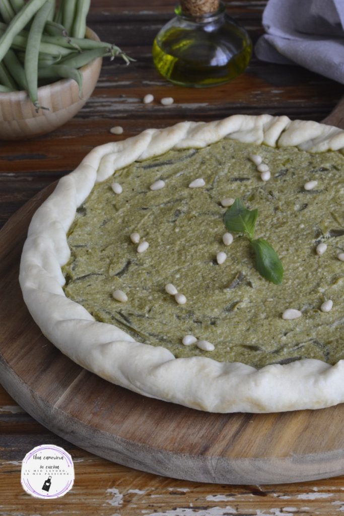 A torta salgada com ricota, pesto e vagem é ideal para servir tanto como aperitivo quanto como entrada. Uma deliciosa massa brisé, neste caso, usei a pronta para acelerar a receita, recheada com fresquíssima ricota de vaca (ou de cabra, ovelha ou mista), vagem, aqui também congelada ou fresca, ambas estão ótimas e o perfumado e saboroso pesto, já pronto de ótima qualidade ou feito em casa. Para uma receita mais rica, você pode adicionar também batatas previamente cozidas e cortadas em cubos para adicionar ao recheio.