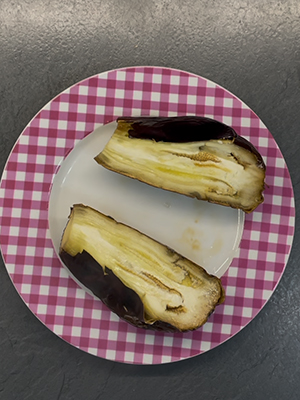 Lave a berinjela, seque e faça furos na superfície com a ponta de uma faca. Cozinhe na fritadeira sem óleo por 15 minutos a 190 graus, depois vire e cozinhe por mais 5 minutos (ou no forno por 50 minutos a 190 graus). Coloque a berinjela em um prato, remova o pedúnculo e corte ao meio.
