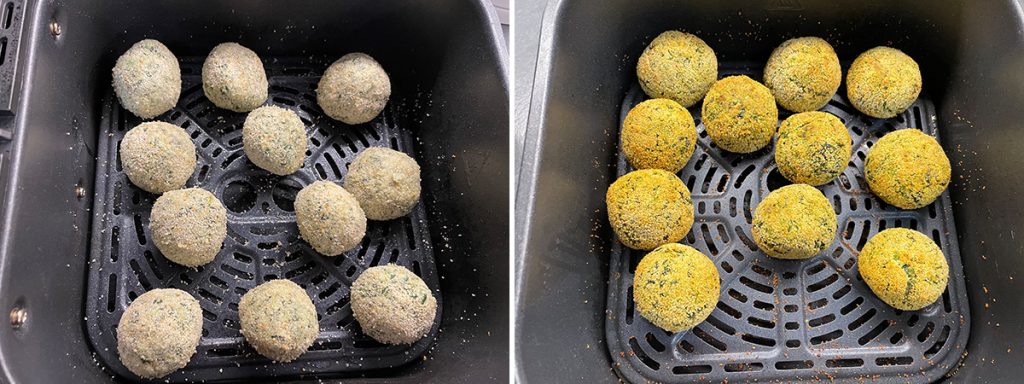 Coloque as almôndegas de ricota e espinafre diretamente na grelha da fritadeira a ar, borrife-as com um fio de azeite e cozinhe a 180 graus por cerca de 15 minutos, virando-as na metade do tempo.