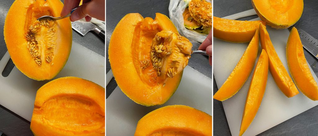 • Lave o melão, corte ao meio e remova a parte central com sementes e filamentos.