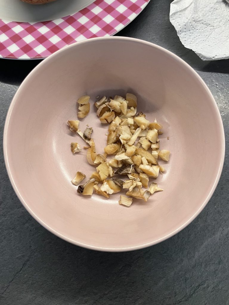 Primeiro, limpe os cogumelos eliminando a terra com um pincel ou um pano úmido, depois elimine a parte final do talo que fica dura. Corte os talos em pedacinhos e coloque-os em uma tigela.