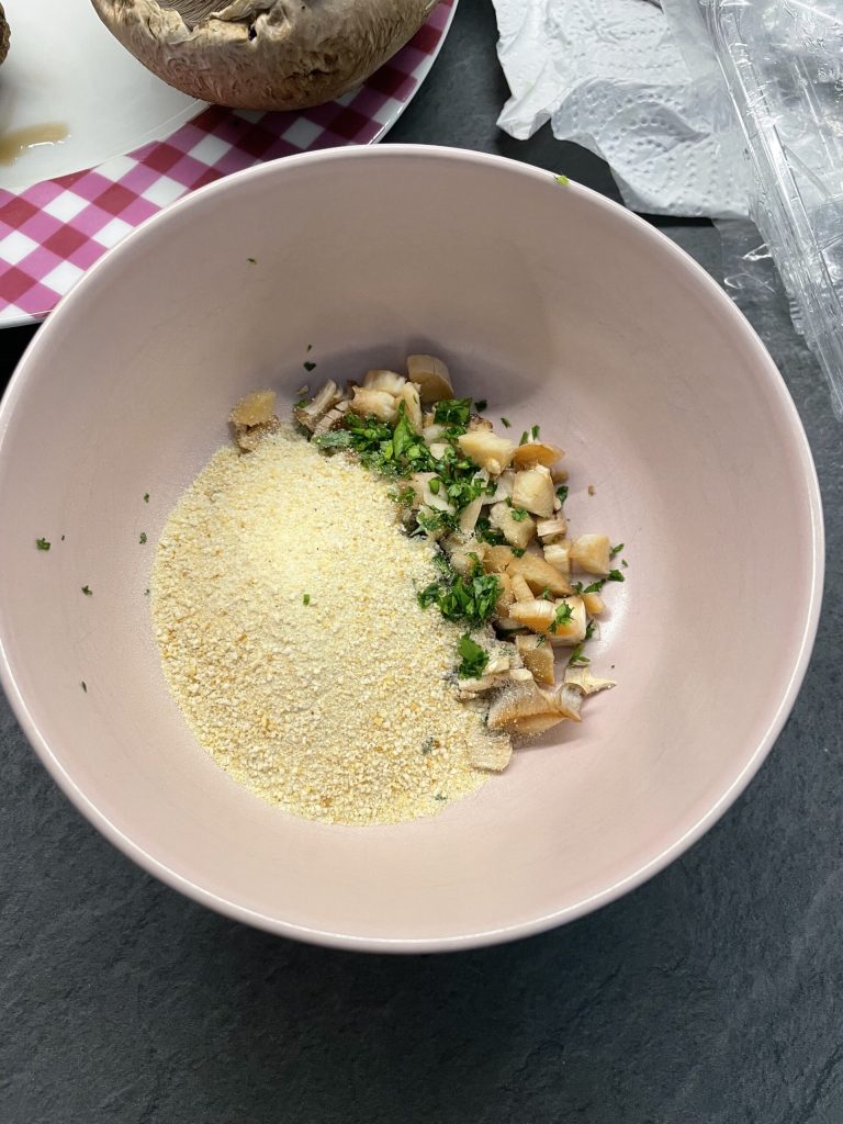É um prato muito simples de preparar: você pode cozinhar os cogumelos tanto no forno quanto na fritadeira a ar, e na receita você encontra ambas as indicações. O recheio é saboroso, feito com os talos dos cogumelos, pão, queijo, alho e salsa.