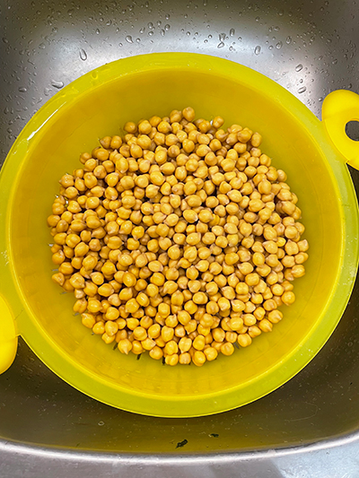 Agora escorra o grão-de-bico e deixe esfriar completamente. Se preferir, neste ponto você pode adicionar sal, dar uma boa mexida e dividir em recipientes herméticos ou sacos, depois guardá-los na geladeira ou no freezer.