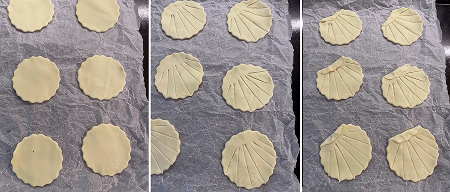 Faça leves incisões com o dorso de uma faca e dobre uma extremidade para simular a forma da concha. Asse em forno pré-aquecido a 170 graus por cerca de 14 minutos, depois deixe esfriar.