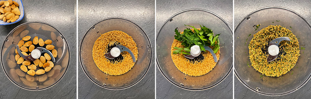 Coloque as amêndoas em um mixer e triture-as, depois adicione a salsinha e triture novamente.