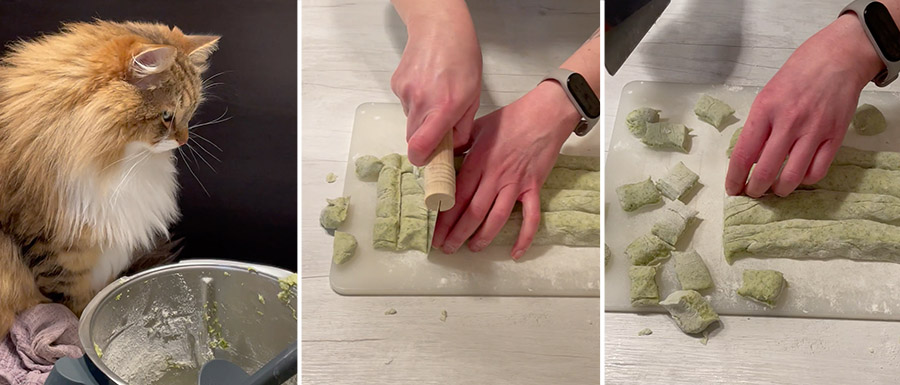 Transfira a massa para a superfície de trabalho enfarinhada e compacte-a com as mãos enfarinhadas. Divida em pedaços e forme rolinhos de massa, coloque-os lado a lado e corte os nhoques com uma espátula com aproximadamente 1,5 cm.
