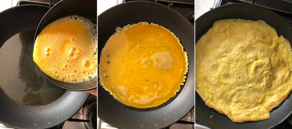 Aqueça o azeite em uma frigideira, despeje os ovos e cozinhe a omelete em fogo médio com a tampa por um par de minutos, então vire-a e cozinhe o outro lado por um minuto.
