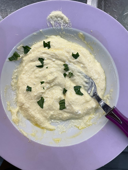 • Coloque a ricota e o ovo em um prato, adicione uma pitada de sal, duas folhas de manjericão picadas e misture até obter um creme.