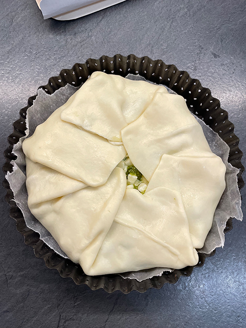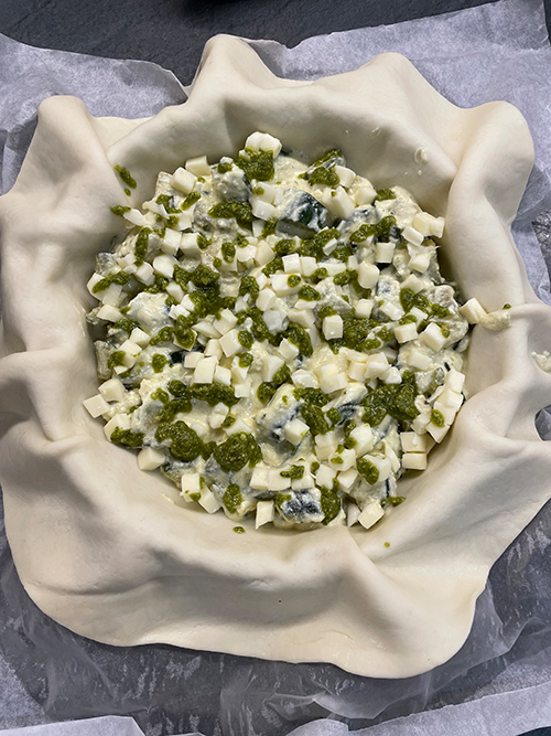 • Finalize com algumas gotas de pesto aqui e ali e feche a torta salgada.