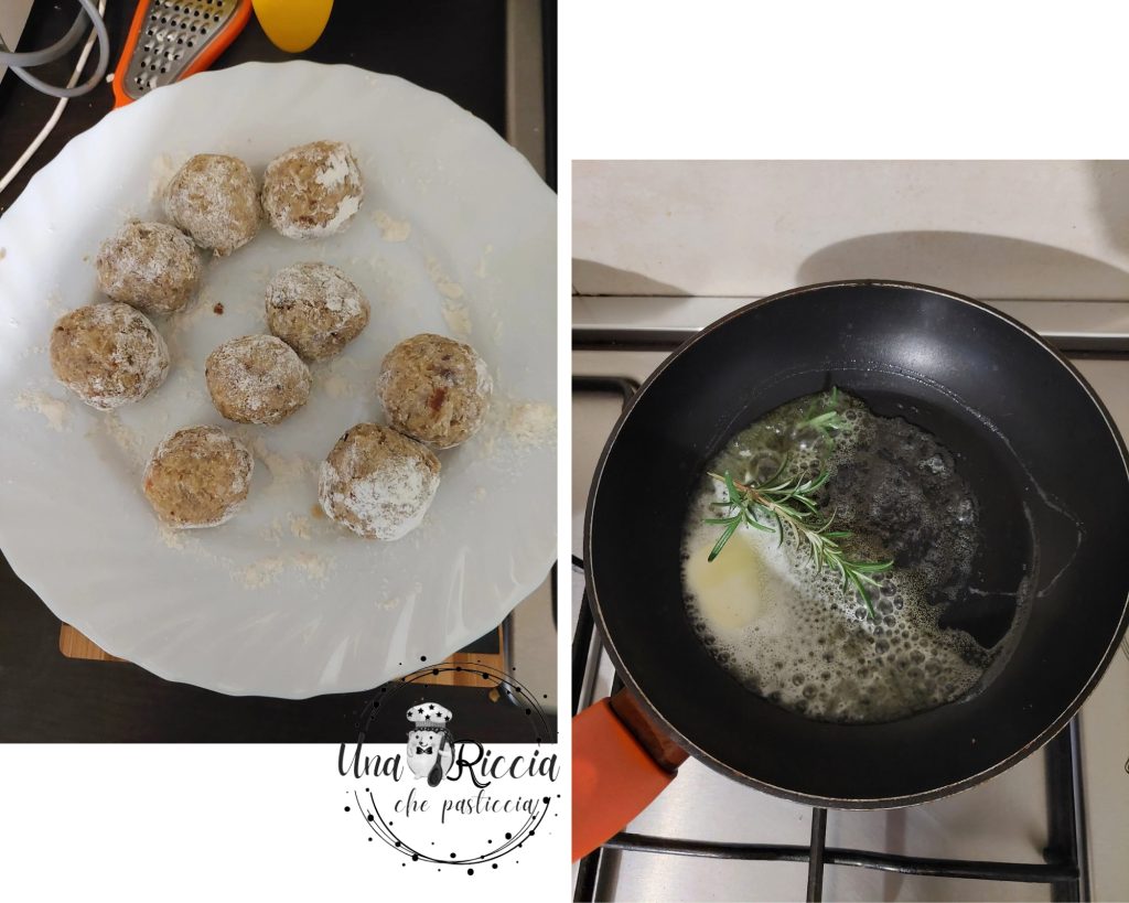 Em uma frigideira antiaderente colocamos a manteiga, um fio de azeite de oliva e um raminho de alecrim, deixamos aquecer levemente, enquanto isso, passamos um pouco de farinha nas almôndegas e enfarinhamos girando-as delicadamente.