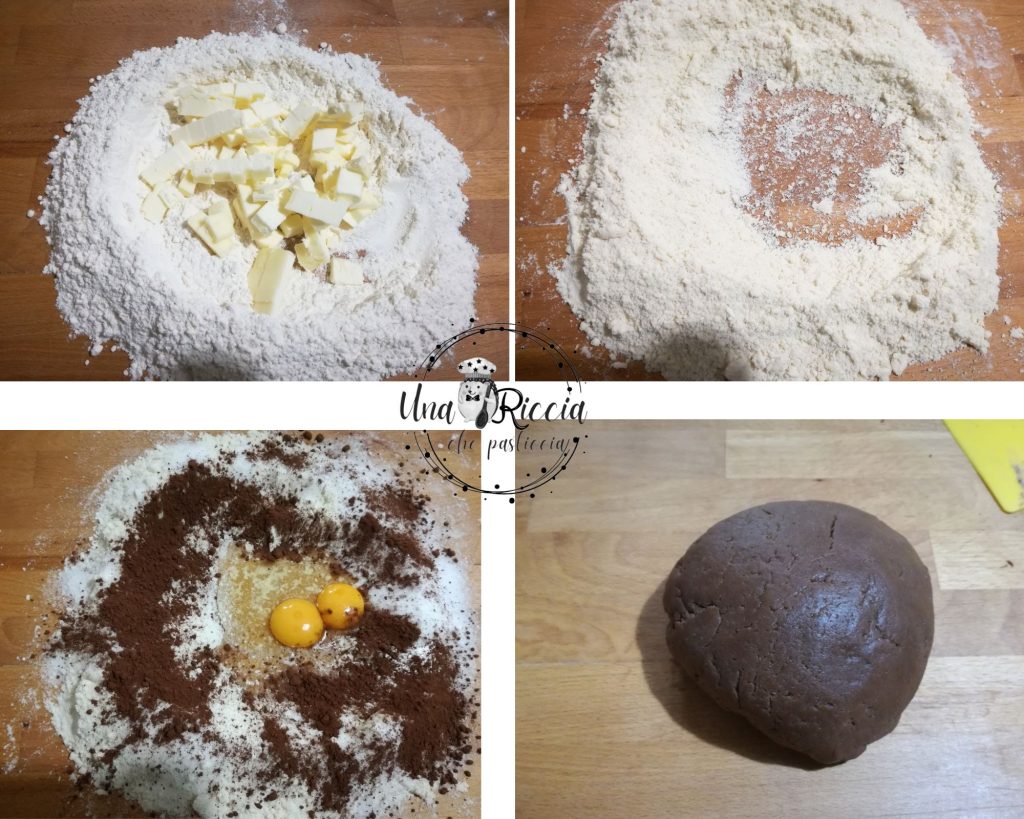 Vamos à preparação da massa amanteigada. Em uma superfície de trabalho, coloque a farinha formando uma fonte e adicione a manteiga fria cortada em pedaços, trabalhe esfarelando, reforme uma fonte e adicione os outros ingredientes, depois amasse rapidamente. Envolva o bloco obtido em filme plástico e deixe descansar por pelo menos meia hora na geladeira.