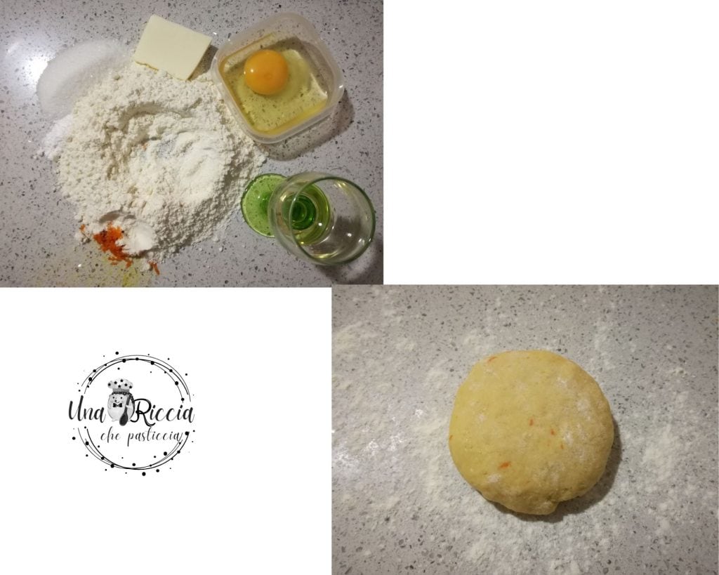 Em uma superfície de trabalho formamos uma fonte com a farinha, o fermento, a casca de uma laranja e o açúcar. Colocamos no centro a manteiga macia em pedaços e começamos a amassar rapidamente. Reformamos uma fonte e adicionamos o ovo ligeiramente batido e o rum, então amassamos e formamos um bloco. Envolvemos em filme plástico e colocamos na geladeira para descansar por cerca de meia hora.