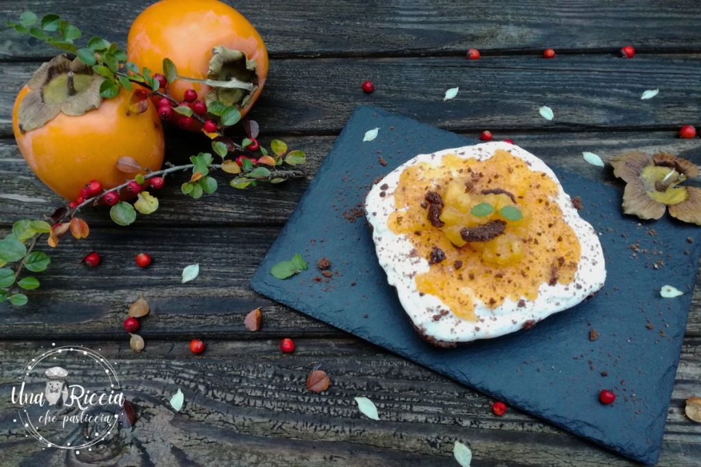 Geralmente, para torná-la mais compacta, utiliza-se gelatina, mas hoje apresento uma versão cremosa e portanto sem gelatina. Completamos nossa cheesecake cremosa com uma fruta de outono que adoro, o caqui-maçã ou vaniglia. Esta variedade de caqui se distingue do mais comum porque pode ser consumida mesmo antes de amadurecer, tendo assim uma textura mais firme, quase como uma maçã.