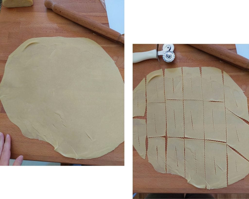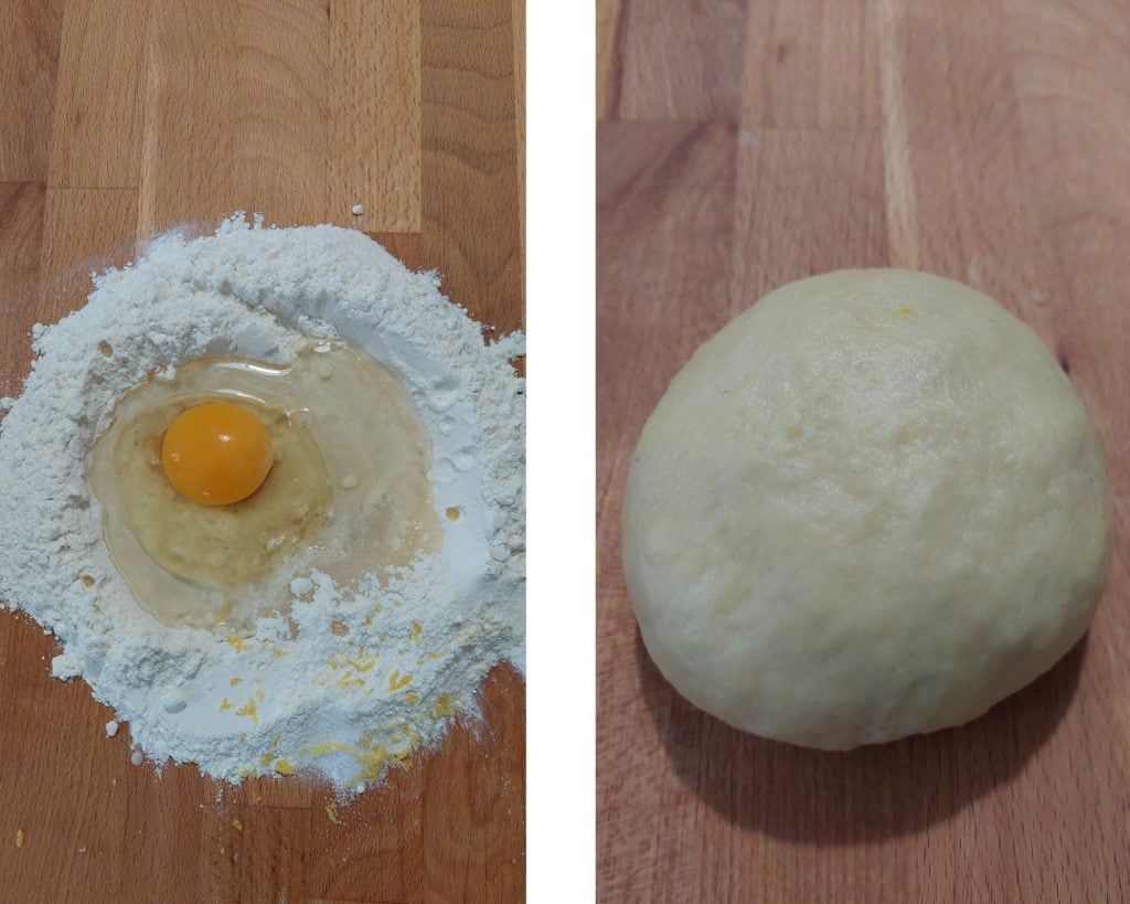 Sobre uma superfície de trabalho, despejamos a farinha e fazemos um buraco no meio para criar a fonte onde colocaremos os outros ingredientes e então colocamos o açúcar, o ovo inteiro, o brandy, o vinho, três ou quatro gotas de limão e um pouco de raspas de limão. Começamos a misturar os ingredientes que estão dentro da farinha com a ajuda de um garfo, incorporando aos poucos também a farinha. Quando a massa começar a se formar, podemos amassar com as mãos até obter uma massa lisa e homogênea.