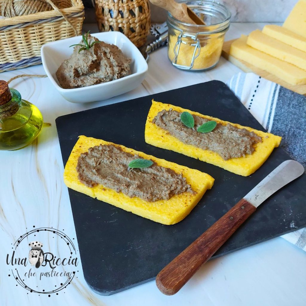 Uma vez obtidos os crostinis de polenta, mas podemos fazê-los também com pão caseiro, espalhamos um pouco de patê de fígados de coelho e servimos com um bom copo de vinho tinto. Antes de tudo, tire uma foto dos seus fígados e poste nas redes sociais me marcando (uma riccia che pasticcia instagram e facebook) e me conte se você usou polenta ou pão.