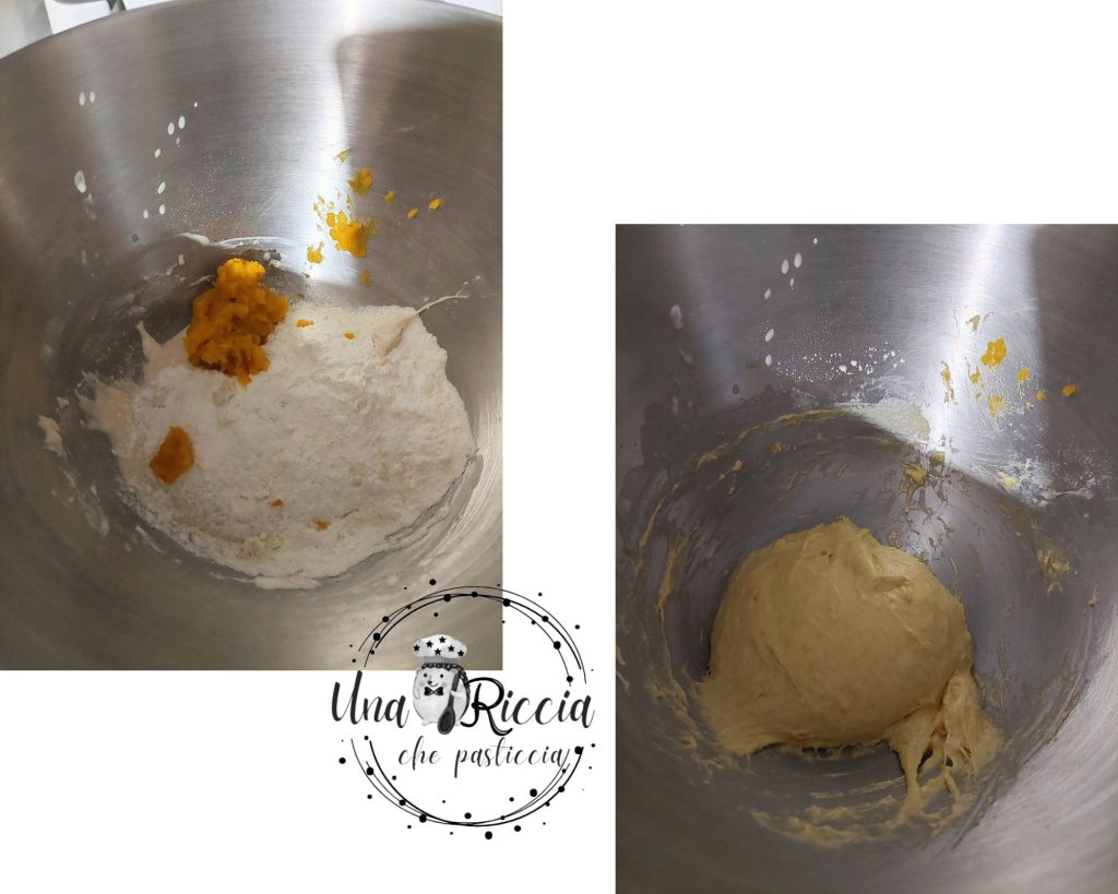 Após o tempo de fermentação do pré-massa, adicionamos o restante da farinha, o sal, o purê de abóbora previamente obtido e começamos a amassar em velocidade média alta, enquanto a massa gira, adicionamos o azeite em fio e deixamos amassar por três ou quatro minutos. Desligamos e batemos energicamente a massa com as mãos dentro da tigela. Transferimos a massa para uma tigela levemente untada e cobrimos com filme plástico. Deixamos fermentar até dobrar de tamanho por cerca de 4 horas.