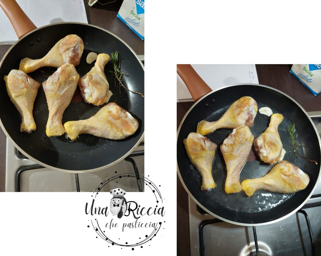 Em uma frigideira antiaderente, colocamos um dente de alho descascado e cortado ao meio junto com um ramo de alecrim e deixamos aquecer a frigideira, depois adicionamos as coxas de frango e deixamos dourar de um lado, viramos e douramos do outro.