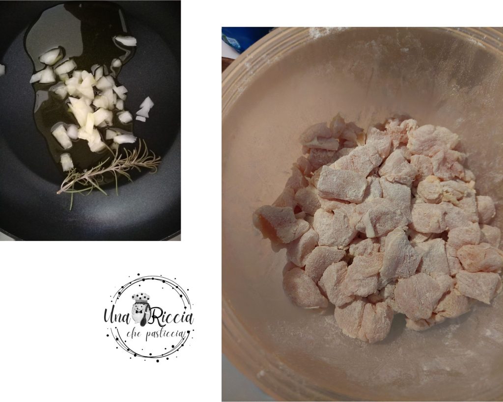 Em uma frigideira antiaderente, colocamos o azeite de oliva, a cebola picada finamente e o ramo de alecrim, e deixamos refogar levemente sem dourar a cebola. Enquanto isso, colocamos cerca de três colheres de sopa de farinha no frango e misturamos para enfarinhar todos os pedaços de carne. Quando a cebola estiver pronta, retiramos o alecrim e adicionamos o curry, misturamos e deixamos tostar levemente, depois adicionamos meio concha de água e continuamos.