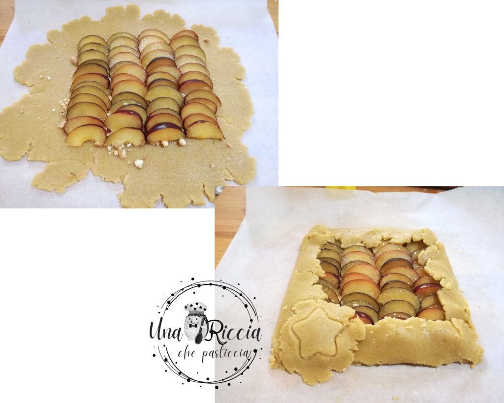 No centro, esfarelamos os biscoitos secos que servirão de base para nossas ameixas. Antes dos biscoitos, você pode espalhar duas colheres de geleia de ameixas.Lave bem as ameixas e corte-as em fatias de cerca de 1 centímetro de espessura. Colocamos sobre os biscoitos e fechamos as bordas da galette com ameixas trazendo a massa restante sobre a fruta.