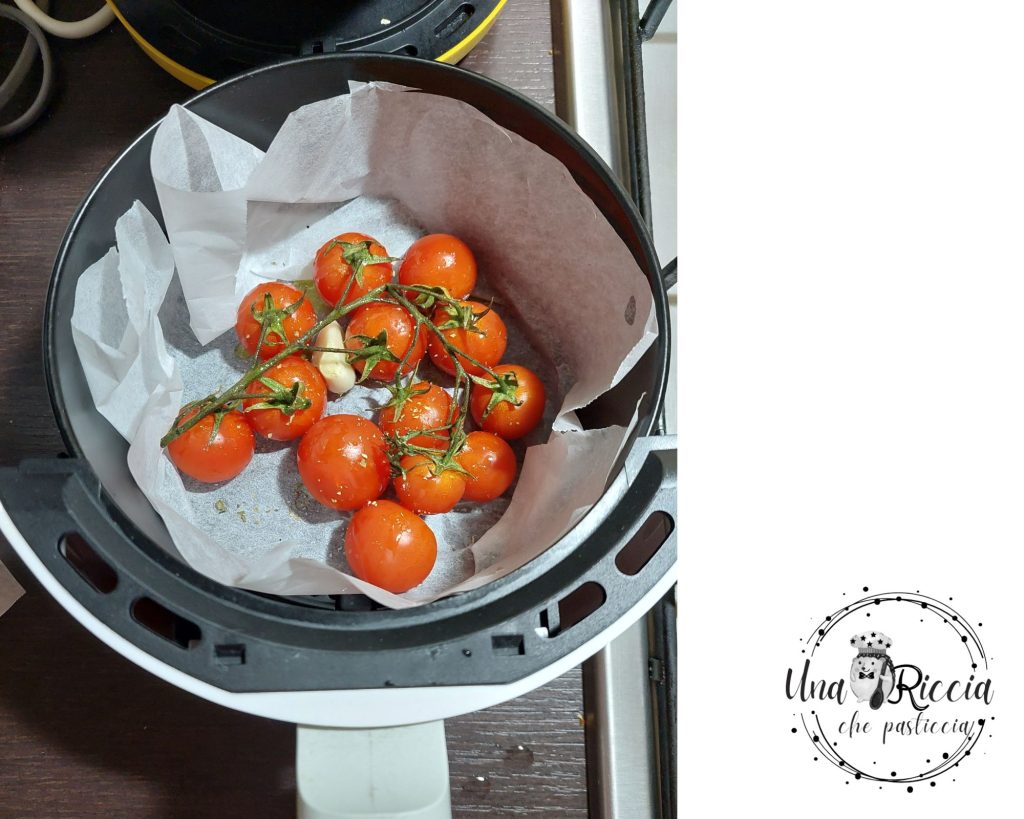 Feche a fritadeira a ar e deixe cozinhar por cerca de 40 minutos. Verifique ocasionalmente o grau de cozimento, os tomatinhos devem estar bem macios e se desfazendo, mas não devem queimar na superfície, caso contrário o molho ficará amargo.