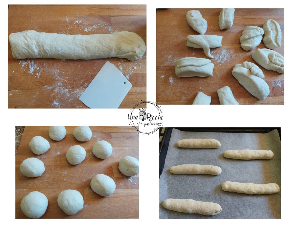 Quando a massa dos pãezinhos para cachorro-quente estiver fermentada, passamos para uma superfície de trabalho levemente enfarinhada e formamos um salsichão do qual cortamos 10 pedaços de cerca de 70/80 gramas.