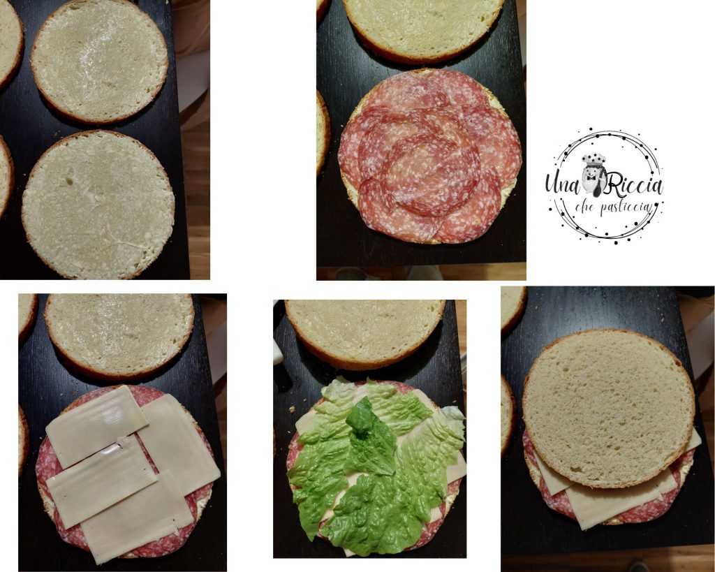 Espalhamos uma camada de maionese nas duas fatias da primeira camada, depois recheamos com as fatias de salame Milano e queijo edamer, tentando cobrir toda a superfície. Lavamos e secamos as folhas de alface e as colocamos sobre o queijo, então fechamos com a fatia de cima.